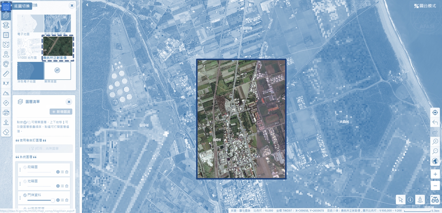 因應系統使用者對於非都市土地正射影像之需求,本系統介接農林航空測量所正射影像圖資,範圍涵蓋都市計畫範圍及非都市計畫區土地,使用者亦可將之與都計區正射影像圖交叉比對,互補未拍攝年份資料。