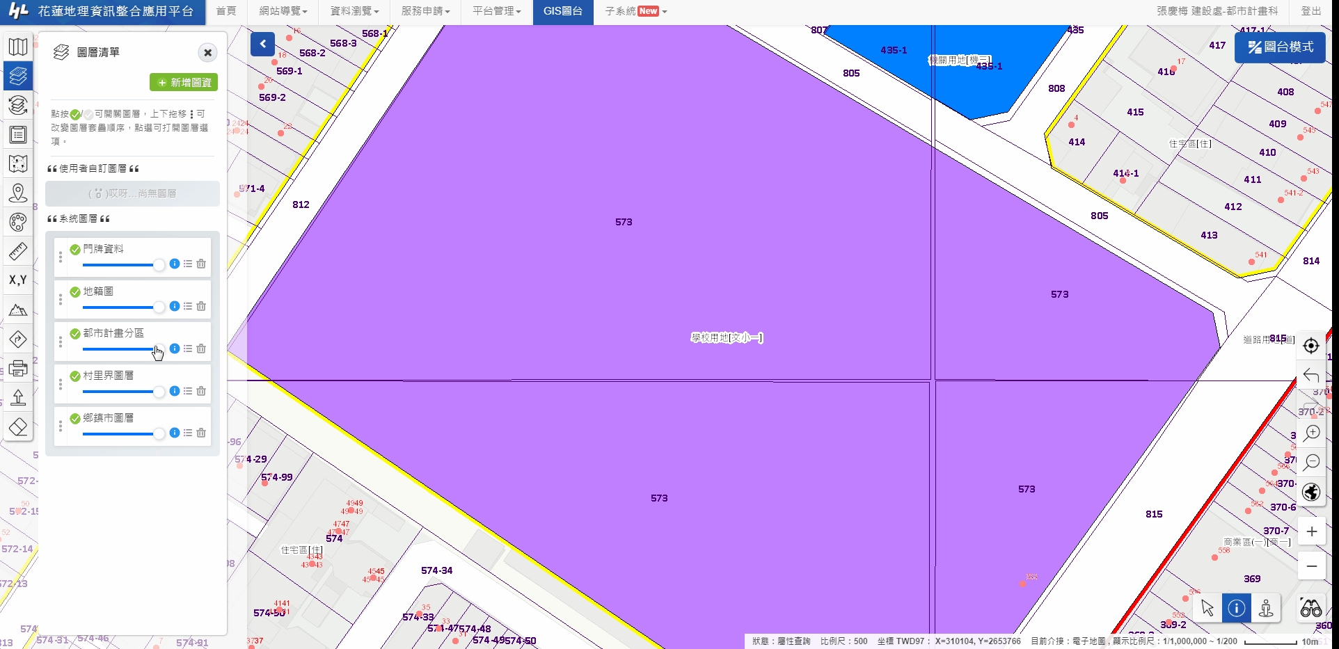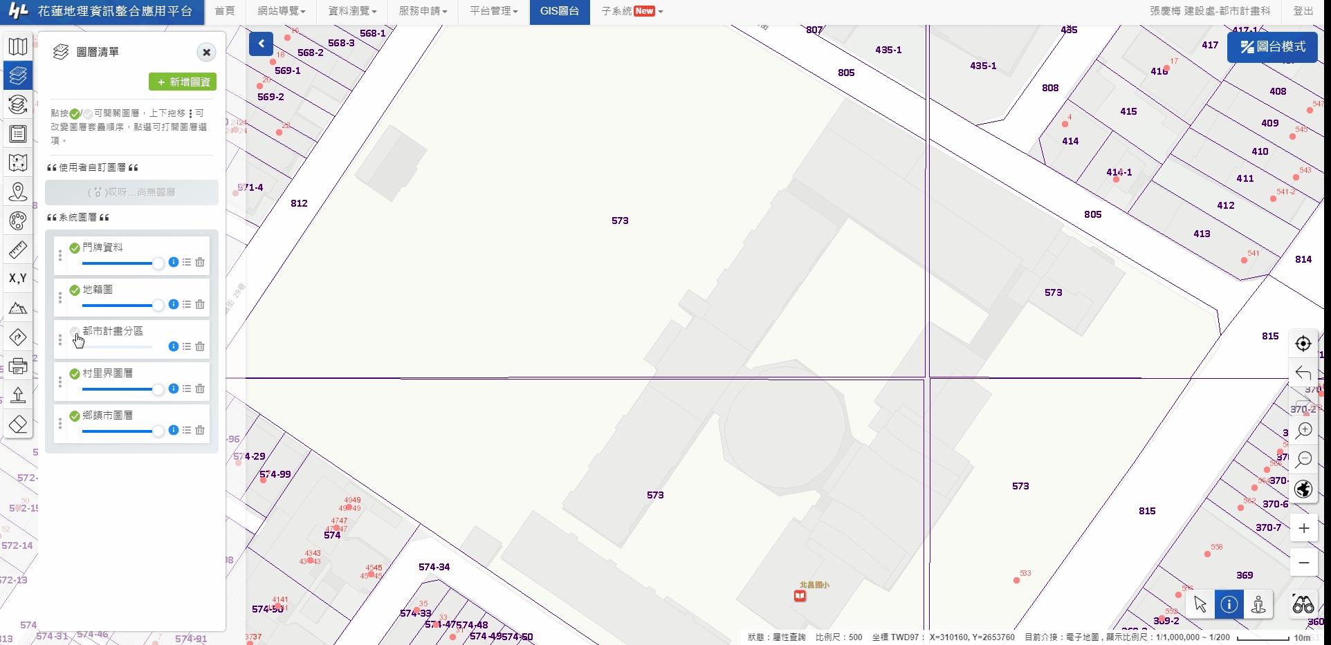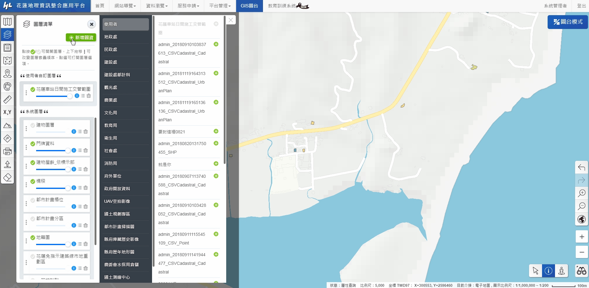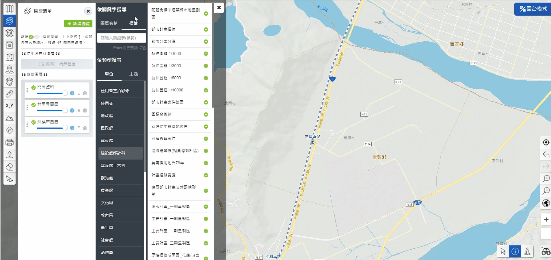 本系統收納百餘種花蓮縣府、內外公務單位及中央機關之業務圖資,本節將介紹圖層的加入、刪除、套疊、隱藏、拖移順序及使用方式。