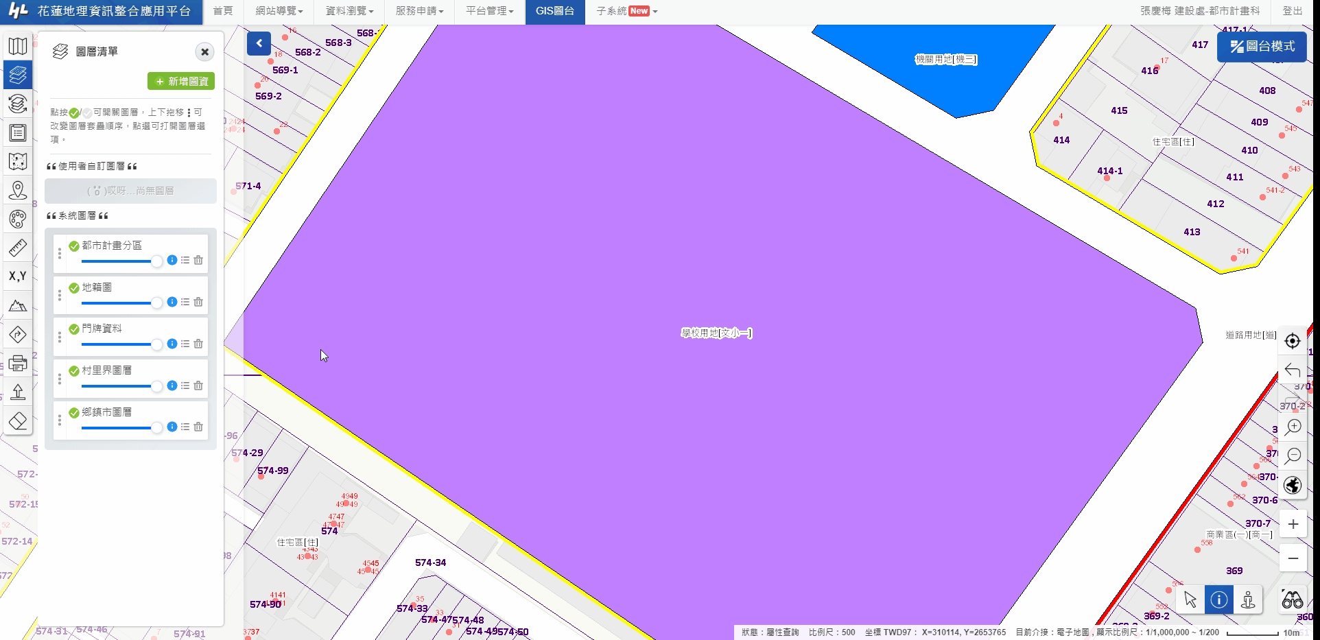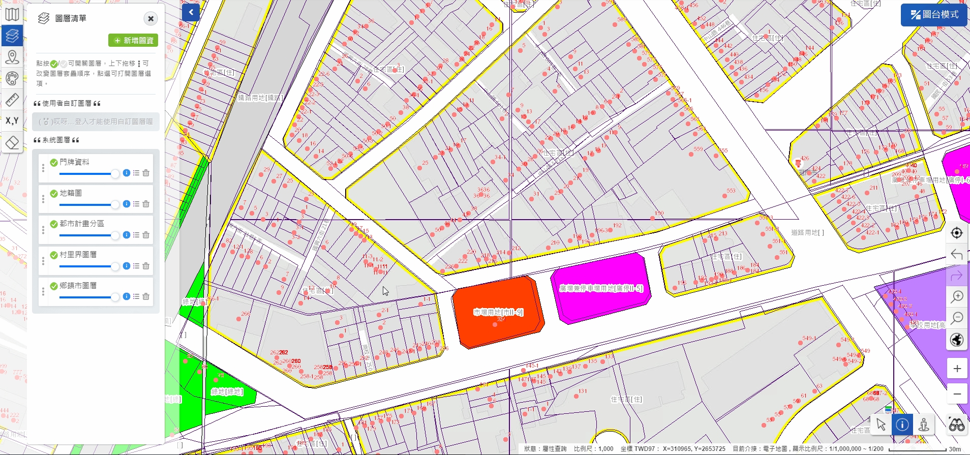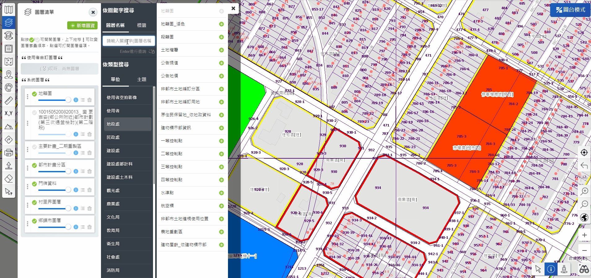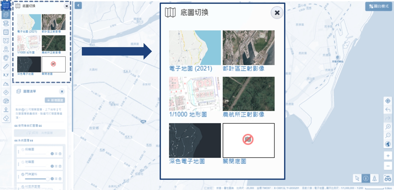 首先,您在功能選單右側欄位,點選「圖層」工具,即可看見圖層清單,此圖層清單內容可依您的使用需求做調整。可使用之圖層內容依使用者權限有所不同。