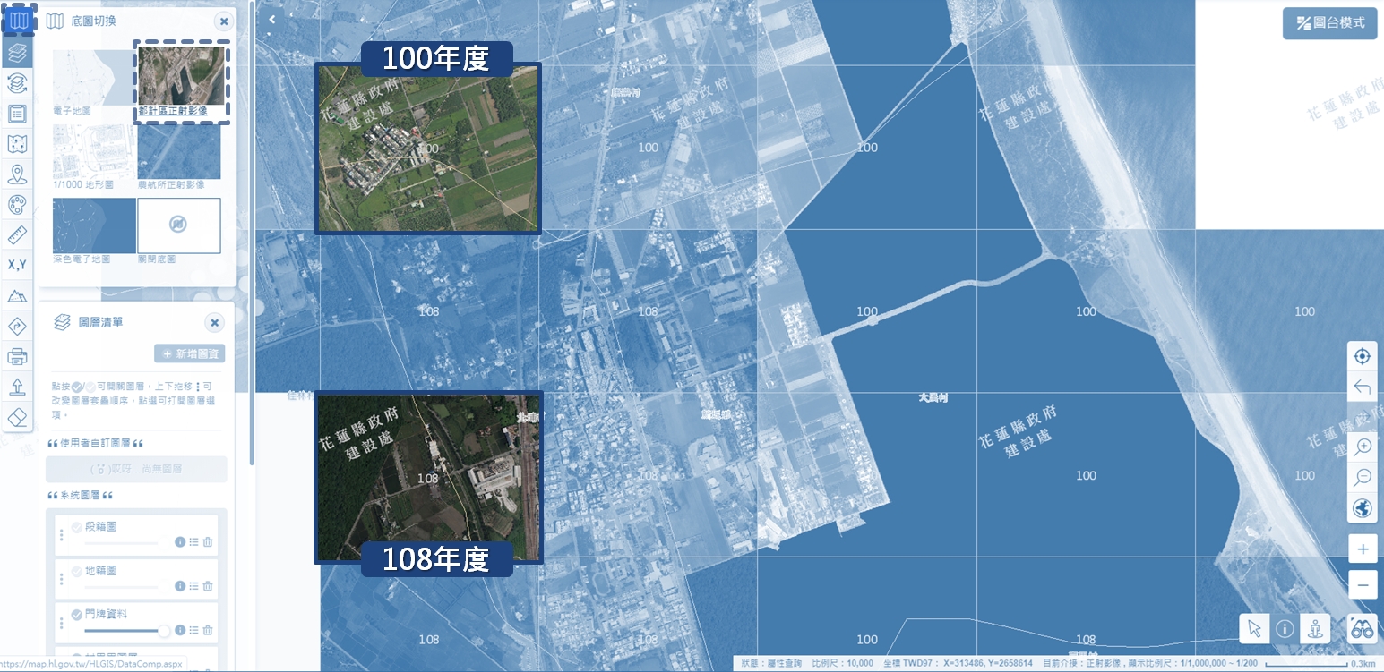 如果您想檢視所查範圍之空拍影像,在都市計畫範圍內可使用「都計區正射影像」,此資料是來自於花蓮縣政府歷年之正射影像圖資,本系統拼接各區域最新之正射影像資訊供使用者套疊使用,各圖幅拍攝時間並非一致,您可以在正射影像圖幅上了解該圖資之拍攝年份,以做更精確之圖資應用及判斷。