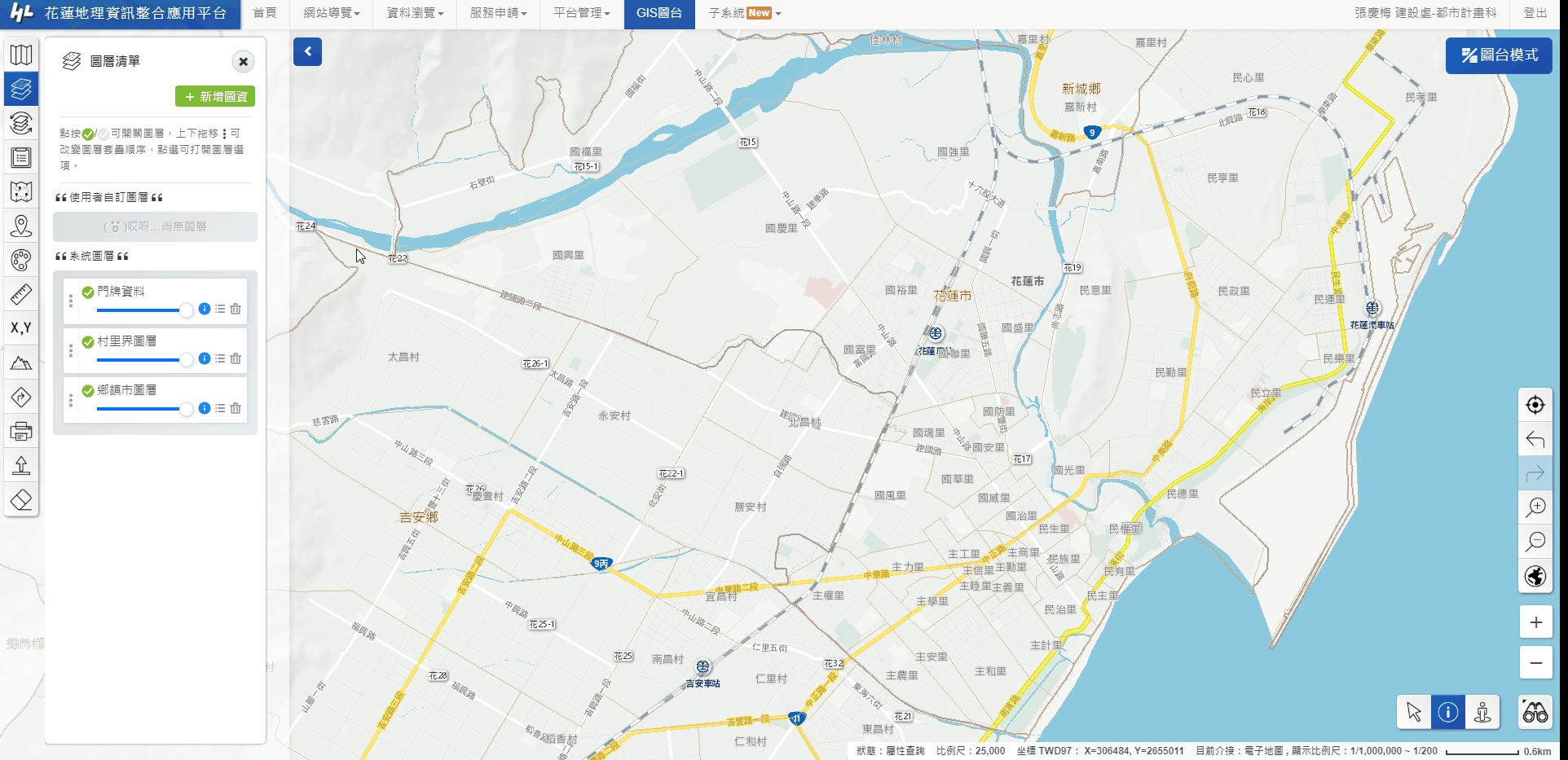 本系統收納中央、花蓮縣內、外公務單位圖資,可於各處項下找到您所需要的圖資。並且可調整該圖層之順序、透明度、可視程度。