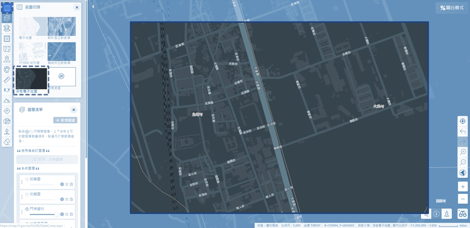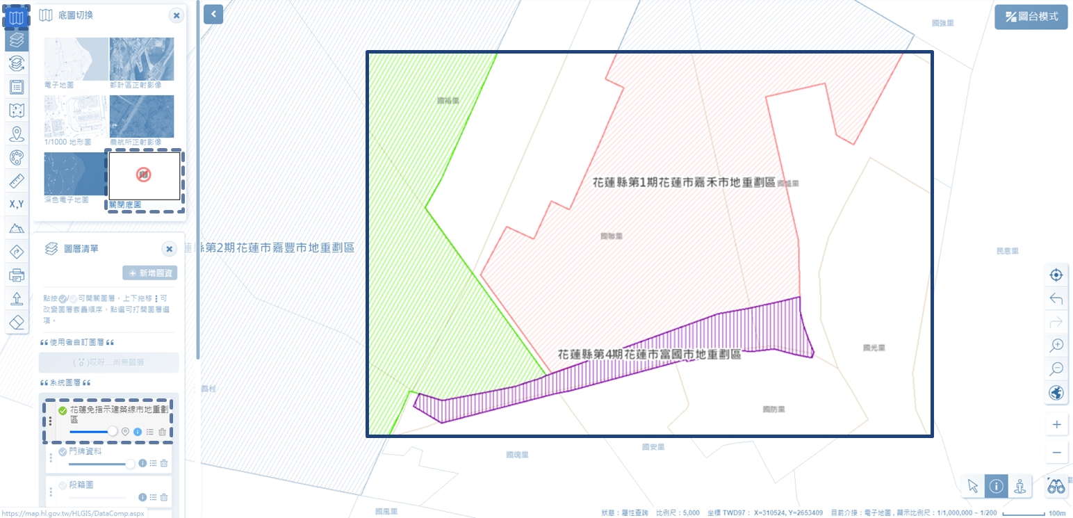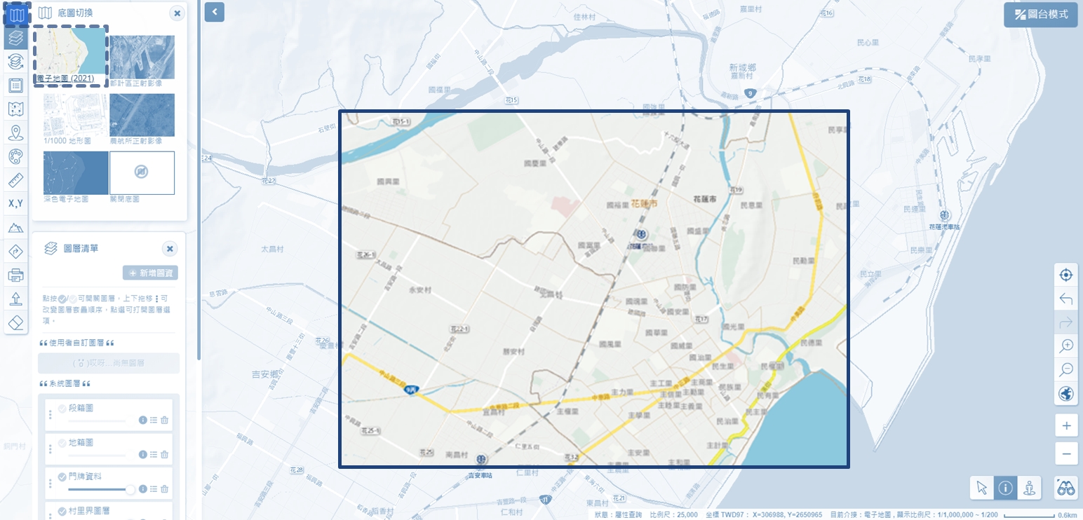本系統提供多種底圖可供使用,您可以使用預設的電子地圖、花蓮縣政府提供之正射影像圖(僅都市計畫範圍)、農林航空測量所提供之正射影像圖(都市計畫範圍、非都市土地)、地形圖、深色電子地圖,亦可選擇不使用底圖。