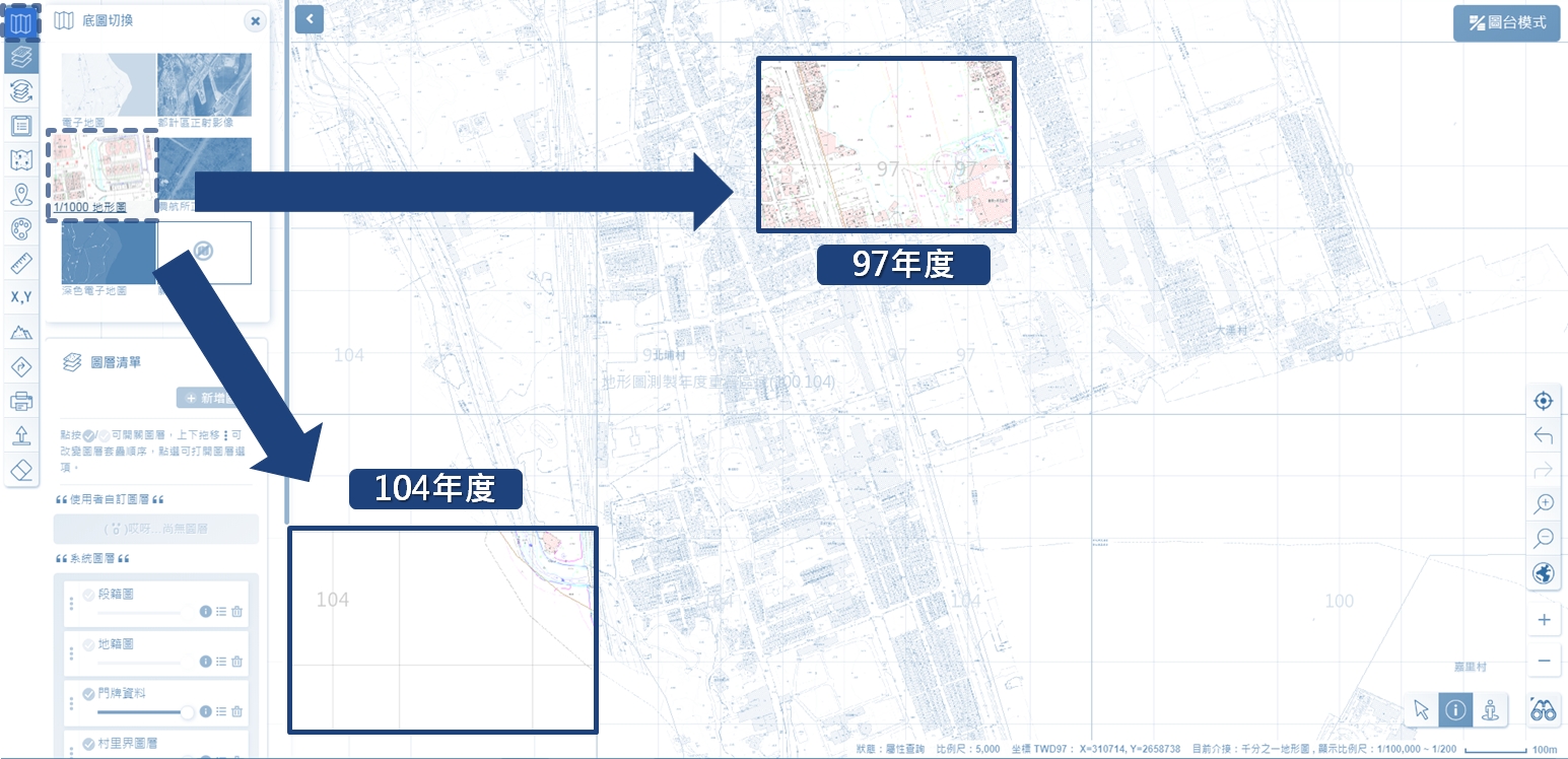 本系統在都市計畫範圍內提供 1/1000 地形圖,您可以使用「1/1000地形圖」底圖,檢視花蓮縣內各都市計畫區內建物、地形、地貌,您可在圖面上看到地形圖產製年份。